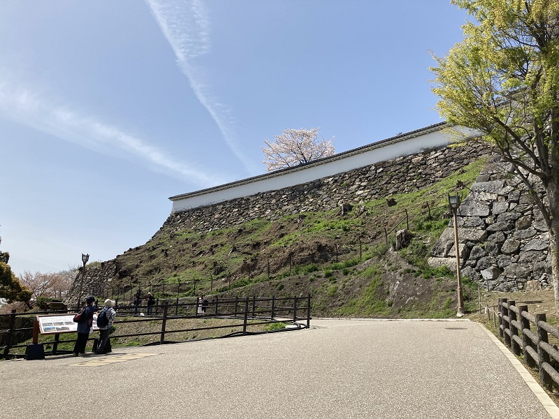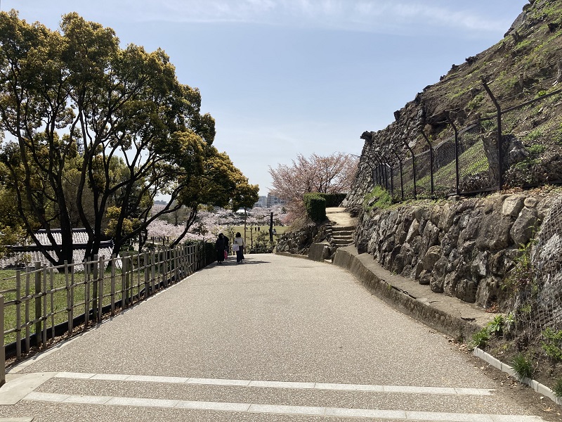 ここから、城郭の石垣に沿って、ゆるい坂道を進んでいきます。