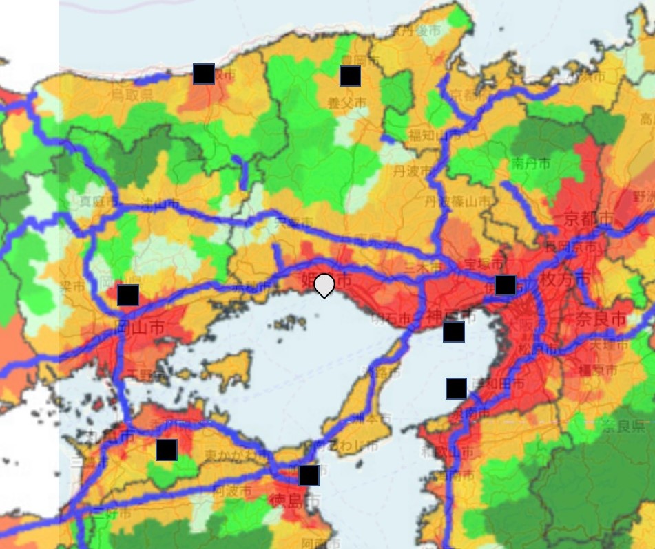 しかし、真ん中に〇で示した、播磨エリアに関しては、人口密度が高く赤色になっているにもかかわらず、空港が整備されていません。