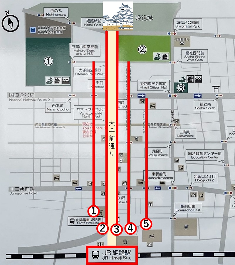 中央に赤色で示したのが、姫路城の有料区域に入る入城口と入城券販売窓口で、3つの門・門跡から、それぞれ歩いていきます。