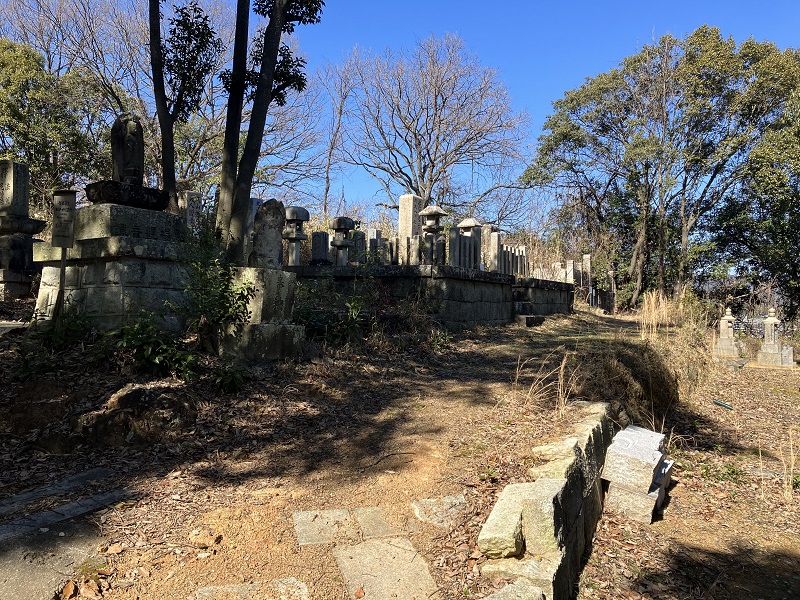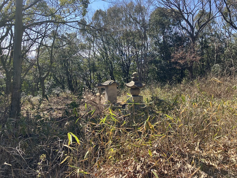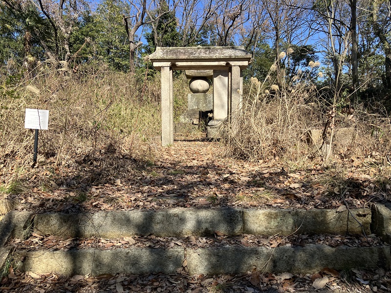 五輪塔型の墓石、墓前亀趺碑、石製の門が残っていますが、周囲は手入れが行き届いていない様子でした。