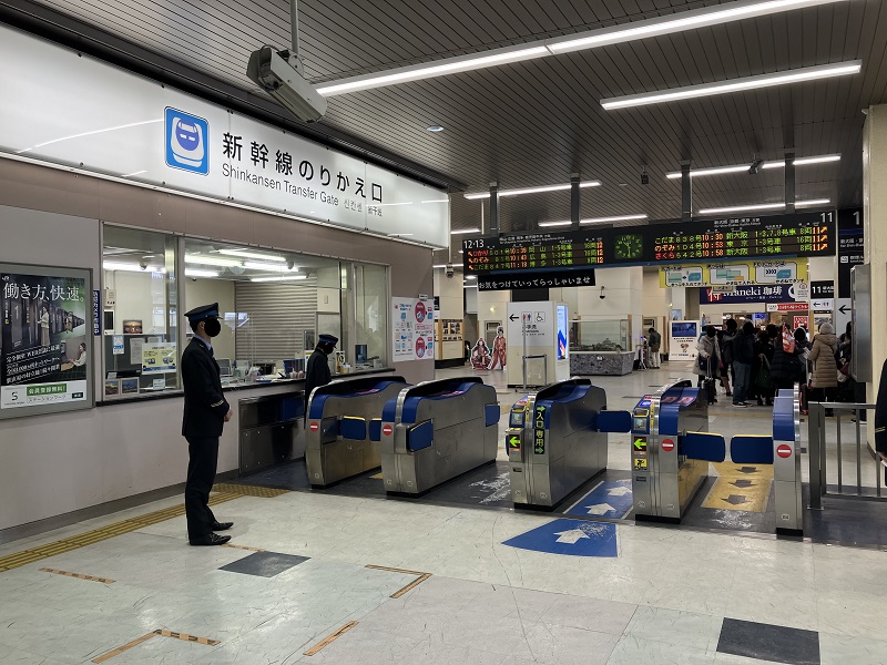 改札口から入って、エスカレーターで2階に上がると、新幹線のりかえ口があります。