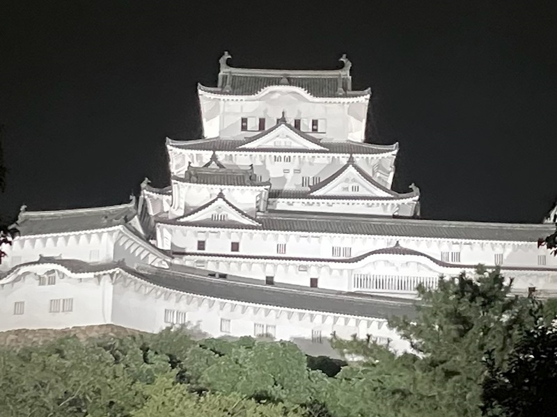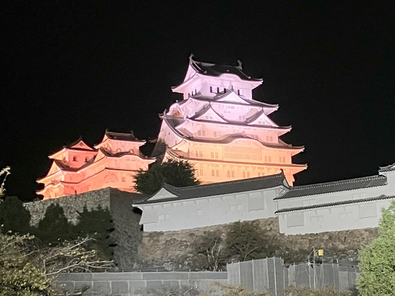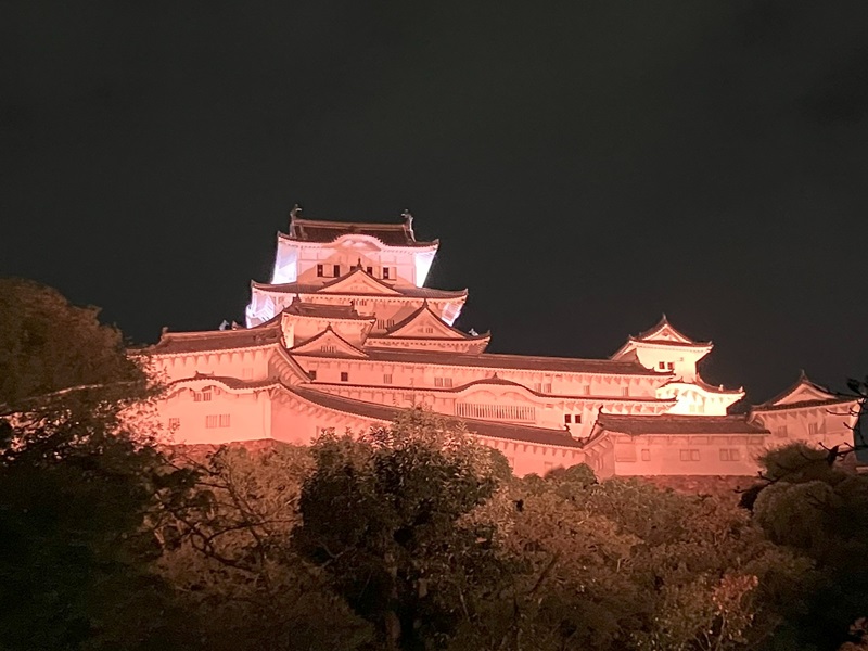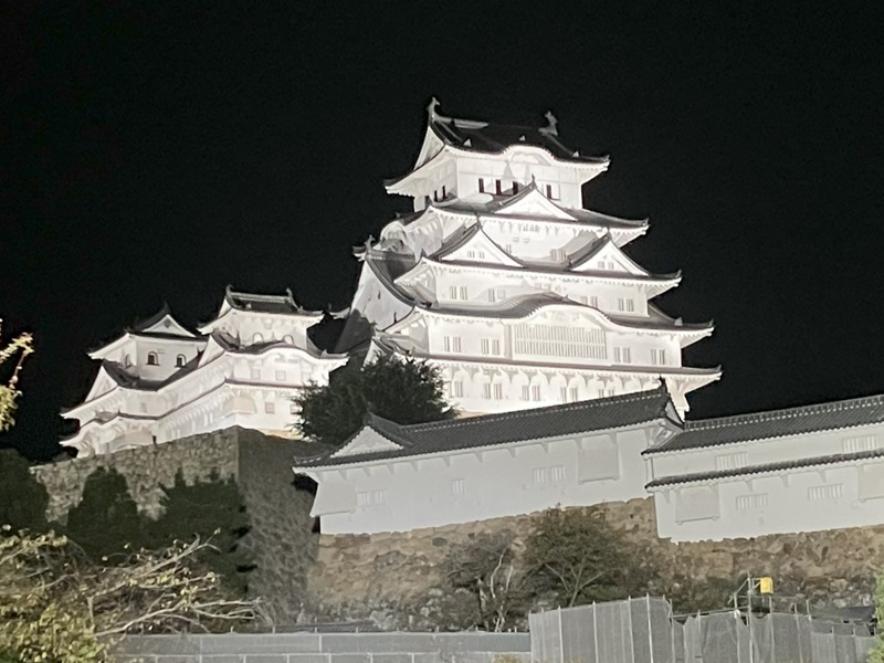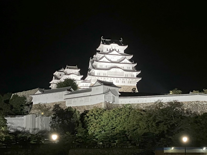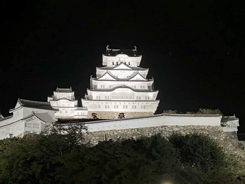 姫路城は、夜になると美しいライトアップが施され、昼間とは異なる幻想的な姿を見せます。