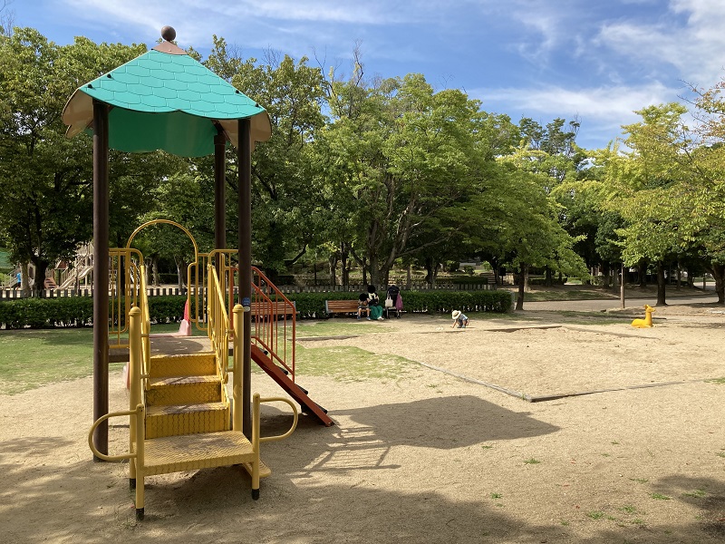 こちらが隣にある、小さな子供が遊べる遊具です。砂場のそばにベンチがあるので、ゆっくり子供を見ていられます。