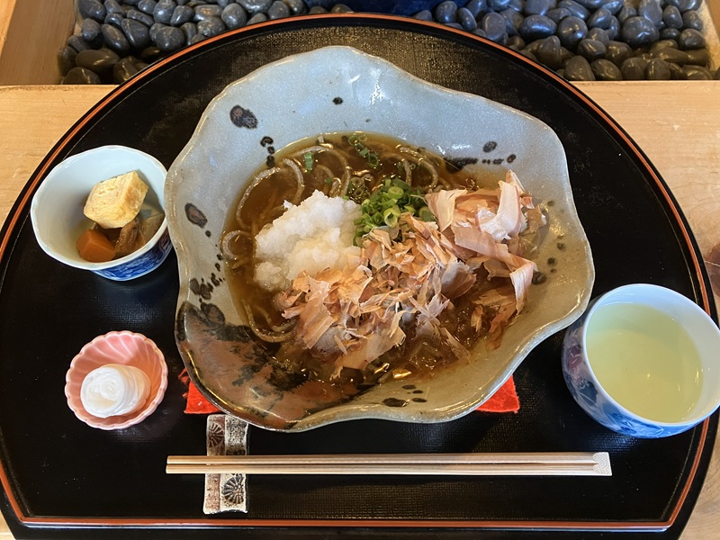 今回は、ぶっかけタイプのおろし蕎麦を注文しました。大根おろしと大きなかつお節、そして愛情がバッチリはいっている感じです。