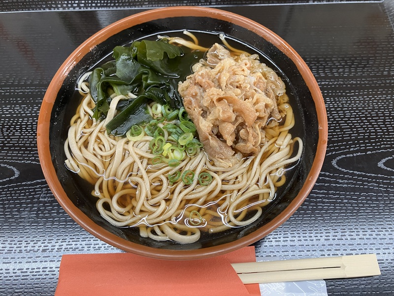 今回は、シンプルな肉そばを選びました。注文してから押し出し式の製麺機で、手際よく麺を仕上げて茹でてくれます。