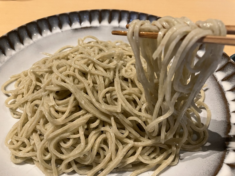 やや細めの麺はほどよいコシがあり、歯切れの良さが心地よく、わずかに緑がかった色合いからは、そば粉の新鮮さを感じられます。