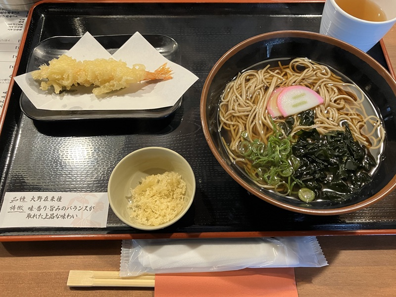 今回は、温かい天ぷら蕎麦を選びました。十割蕎麦で温かいメニューが選べるのも、ひめそばの魅力です。