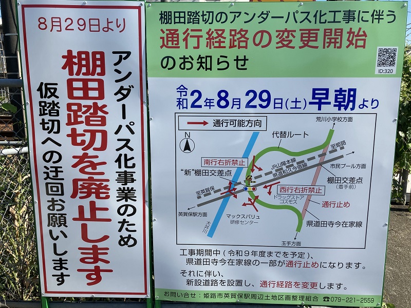 兵庫県姫路市町坪にある、棚田踏切を通る南北の県道が、棚田交差点の立体交差工事にともない、通行経路が変更になります。